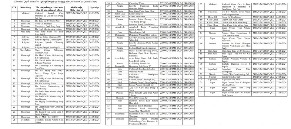 Đáng chú ý, nhiều sản phẩm thuộc dòng chăm sóc da và tóc Nhật Bản như Hatomugi The Tone Up UV Milky Gel, Ichikami Smooth Care Shampoo & Conditioner, Softymo Deep Cleansing Oil vốn được nhiều người tiêu dùng Việt sử dụng. Ngoài ra, các sản phẩm dành cho trẻ em như Arau Baby Foam Full Body Soap, Lion Children’s Toothpaste cũng nằm trong diện thu hồi.