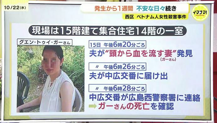 Thi thể người phụ nữ Việt Nam được phát hiện trong khu chung cư ở quận Nishi, Hiroshima. Ảnh: TSS TV