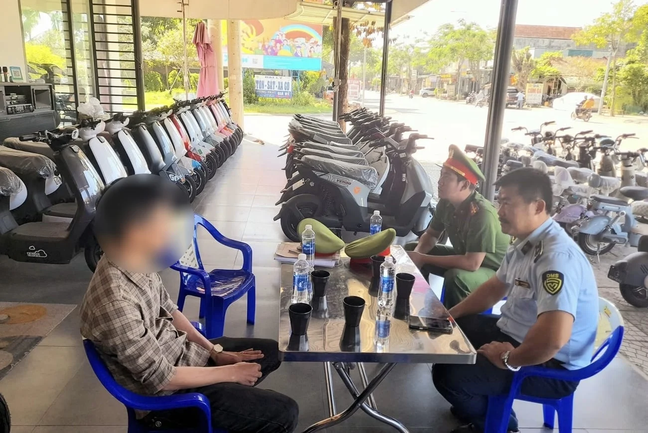QLTT Quảng Ngãi và Công an xã Nghĩa Hành làm việc với chủ Công ty kinh doanh xe đạp điện, xe máy điện vi phạm về nhãn hàng hóa. Ảnh: CAX Nghĩa Hành.