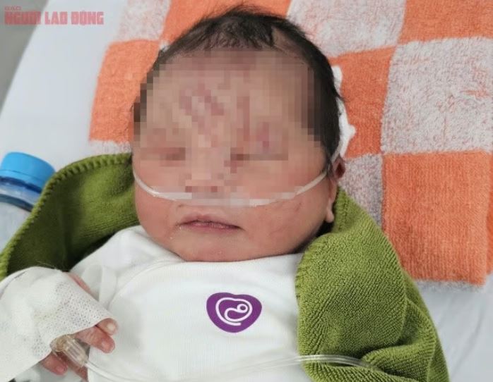 Bé sơ sinh có nhiều vết xước trên mặt và vết chấm đỏ ở cẳng tay, cẳng chân nghi do bị động vật cào và côn trùng đốt.