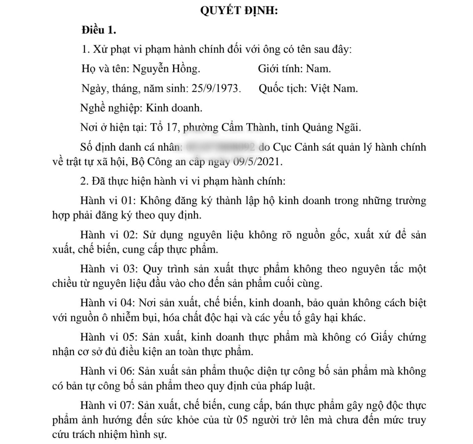 Theo quyết định xử phạt, ông Nguyễn Hồng đã thực hiện 7 hành vi vi phạm, gồm: không đăng ký thành lập hộ kinh doanh theo quy định; sử dụng nguyên liệu không rõ nguồn gốc, xuất xứ; quy trình sản xuất thực phẩm không bảo đảm nguyên tắc một chiều; khu vực sản xuất, chế biến, bảo quản thực phẩm không cách biệt với các nguồn ô nhiễm.