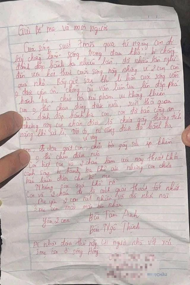 Nội dung bức thư cho biết người mẹ trải qua 7 năm sống trong đau khổ vì bị chồng hành hạ. Dù đã ly hôn, cuộc sống vẫn không yên ổn khi chồng cũ liên tục tìm đến đập phá, chửi bới. Phần cuối thư thể hiện ý định tiêu cực và nhắn nhủ người nhặt được liên hệ gia đình để vớt thi thể ba mẹ con.