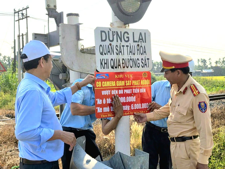 Cơ quan chức năng lắp biển cảnh báo phạt nguội ở điểm giao nhau giữa đường bộ và đường sắt, thời gian tới sẽ mạnh tay xử lý – Ảnh: BẢO BẢO