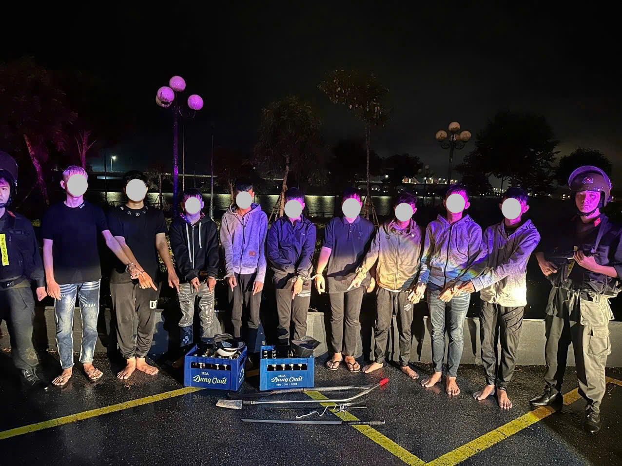 Khi thấy lực lượng Cảnh sát cơ động, một số thanh niên bỏ chạy, Tổ tuần tra đã nhanh chóng áp sát, bắt giữ 09 đối tượng gồm: D.A.V (SN: 2010), N.V.C.N (SN: 2010) cùng trú tại xã An Phú, tỉnh Quảng Ngãi; V.Đ.H (SN: 2009), Đ.L.S (SN: 2009), L.K (SN: 2009), P.H.Đ (SN: 2009), H.N.T (SN: 2010) cùng trú tại phường Trương Quang Trọng, tỉnh Quảng Ngãi; T.Đ.K (SN: 2009), N.L.T (SN: 2008) cùng trú tại xã Tịnh Khê, tỉnh Quảng Ngãi.