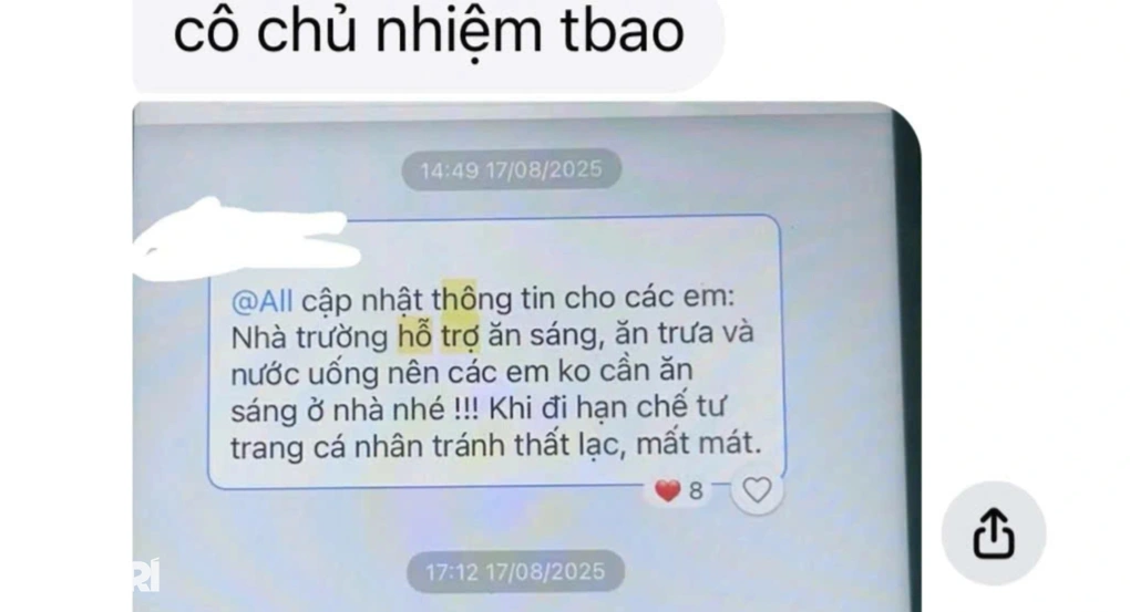 Tuy nhiên, trước đó, chúng em còn nhận được thông tin từ chính cô chủ nhiệm và anh chị quản sinh là sẽ được hỗ trợ ăn uống”, P. nói, kèm theo tin nhắn làm bằng chứng.