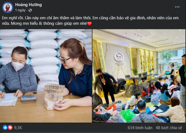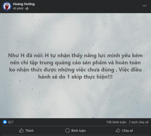 Còn trong tối 3/10, sau khi tin tức bị bắt vì trốn thuế phủ sóng mạng xã hội, Hoàng Hường đăng dòng trạng thái thanh minh: “Như Hường đã nói: Hường tự nhận thấy năng lực mình yếu kém nên chỉ tập trung quảng cáo sản phẩm và hoàn toàn không nhận thức được những việc chưa đúng. Việc điều hành sẽ do 1 ekip thực hiện!”.