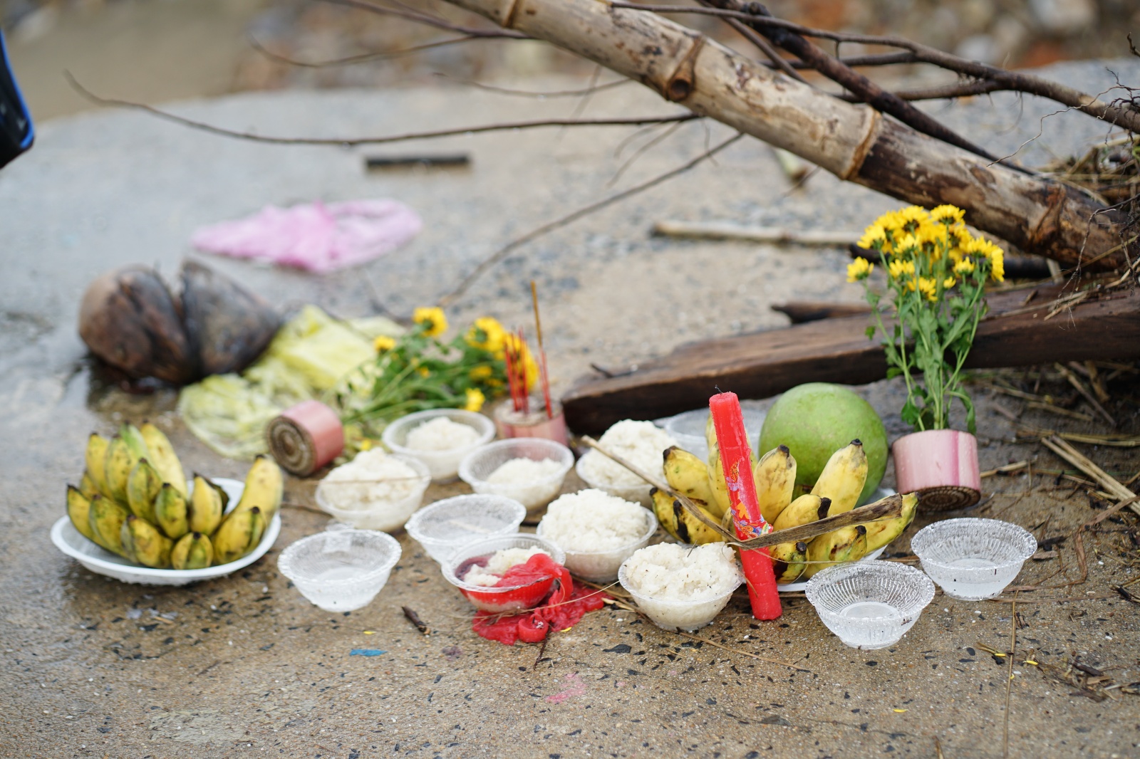 Những phần hoa quả, nhang đèn được đặt tại hiện trường nơi hai vợ chồng gặp nạn, thể hiện nỗi xót thương và tưởng nhớ của người thân, hàng xóm.