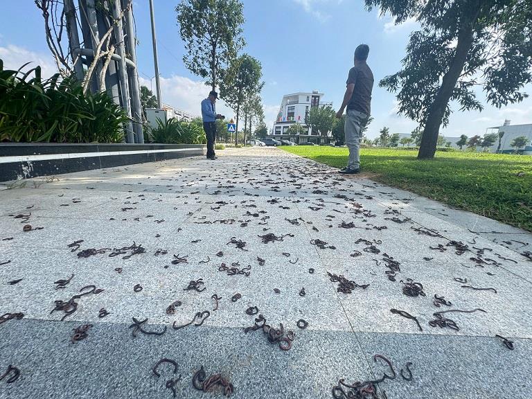 Giun bò dày đặc lên vỉa hè trước cổng khu đô thị Phú Mỹ ở Quảng Ngãi. Ảnh: Viên Nguyễn