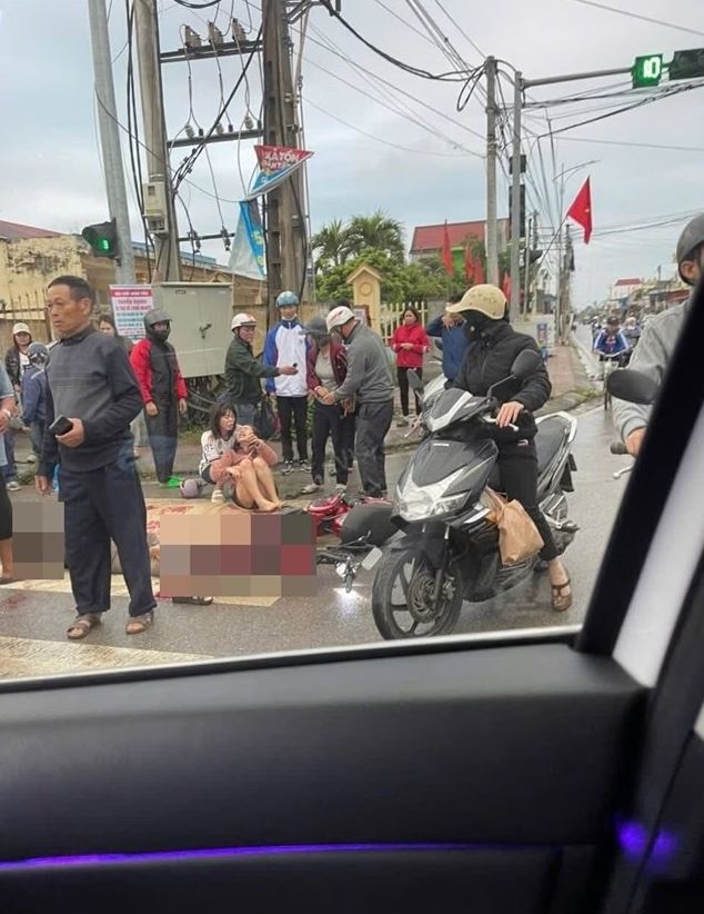 Hình ảnh từ clip và các bức ảnh ghi lại tại hiện trường cho thấy một xe máy đổ nằm giữa đường, cạnh đó là hai bà cháu gặp nạn.