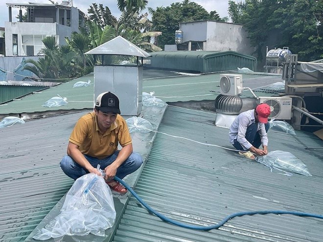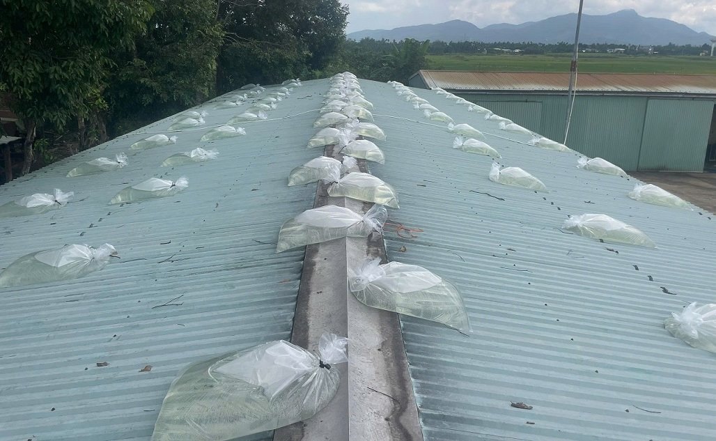 “Bão số 13 được dự báo rất mạnh, nên chúng tôi chủ động gia cố mái nhà bằng bao nước. Cách này vừa an toàn, lại đỡ vất vả hơn so với việc khuân đất cát lên mái,” ông Thuận chia sẻ, tay vẫn thoăn thoắt buộc từng bao nước.