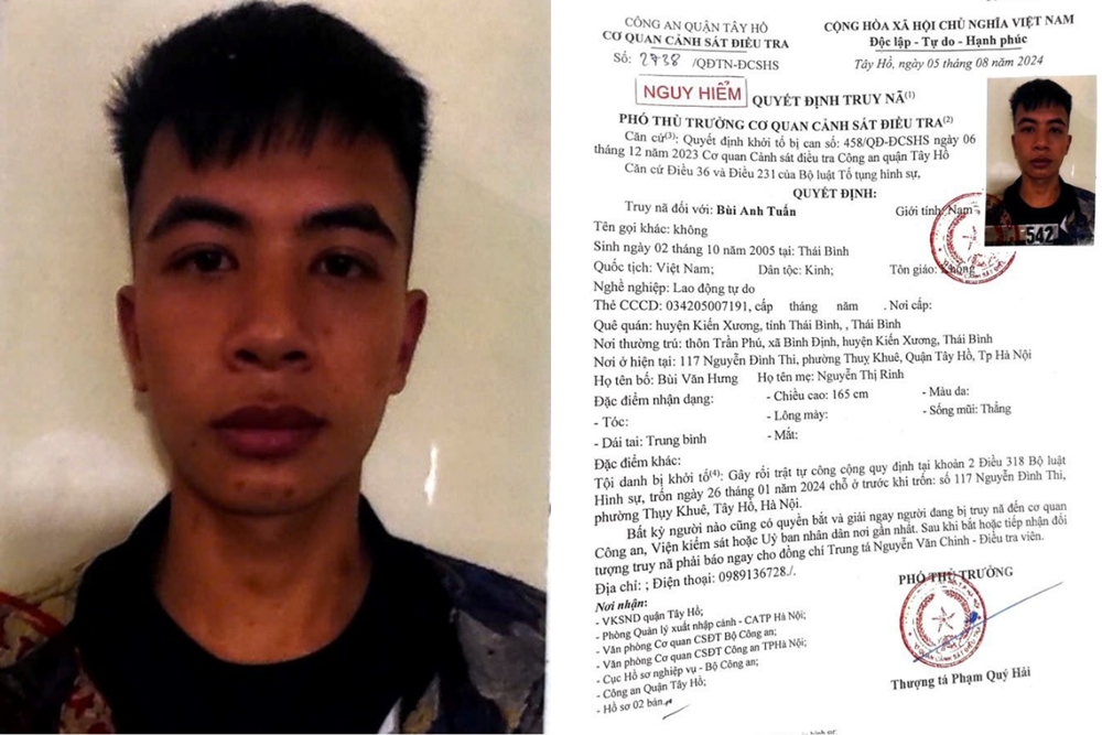 Đến ngày 5/8/2024, Cơ quan CSĐT Công an quận Tây Hồ tiếp tục ra quyết định truy nã bị can đối với Tuấn.