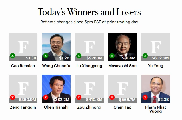 Ông Phạm Nhật Vượng dẫn đầu danh sách tỷ phú sụt giảm tài sản giảm mạnh nhất thế giới hôm nay. Ảnh: Forbes.