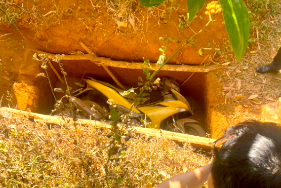 Chiếc xe máy nằm dưới hố sâu khoảng 1m, dài tầm 1,5m, phía trên được che lấp lại bằng tấm bạt xanh da trời. Cách nơi chôn giấu xe máy khoảng 200m có một vị trí bị đốt cháy nghi do các đối tượng đã đốt tiêu hủy áo quần và một số trang bị dùng thực hiện vụ cướp.