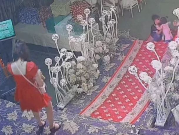 Nữ công nhân đang hát trên sân khấu bất ngờ ngã xuống (Ảnh: Cắt từ camera an ninh).
