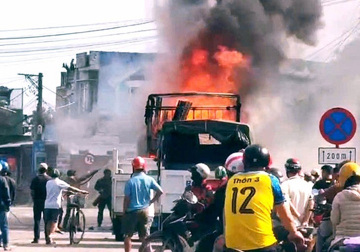 Lửa bốc cháy ngùn ngụt từ xe tải. (Ảnh: Tuổi trẻ)