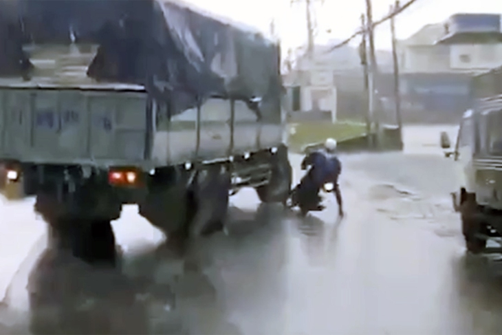 Xe tải do Đỗ Minh Tân lái rẽ phải đột ngột va chạm với xe máy cùng chiều, sau đó hai lần cán qua nạn nhân – Ảnh: CTV