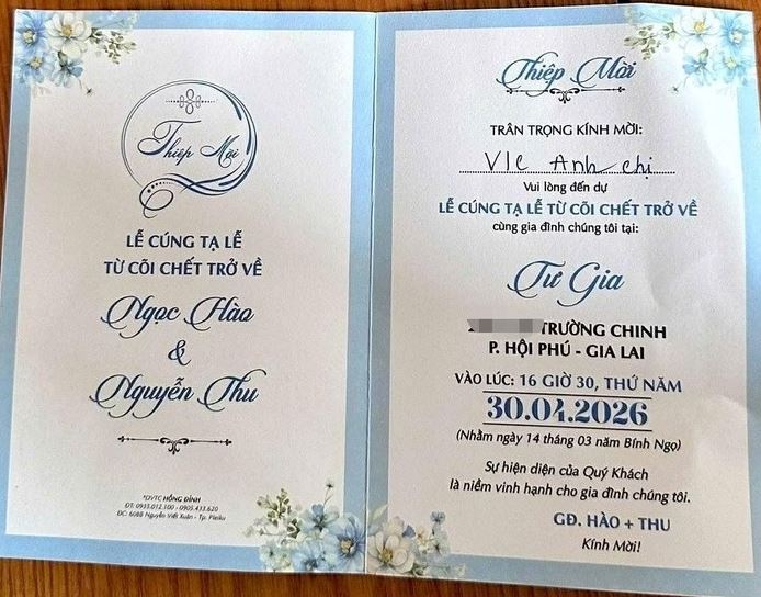 Theo thông tin trên thiệp mờ, buổi lễ sẽ được tổ chức vào chiều ngày 30/4 tại nhà riêng của gia đình ở phường Hội Phú. Thông tin này nhanh chóng thu hút sự chú ý của nhiều người bởi cách gọi tên buổi lễ khá đặc biệt.