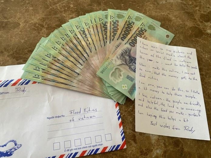 Trước giờ rời Việt Nam, anh Andrew (quốc tịch Đức) đã để lại một món quà đặc biệt tại khách sạn anh lưu trú ở Quảng Ninh: 10 triệu đồng cùng một bức thư tay, mong gửi đến người dân vùng lũ.